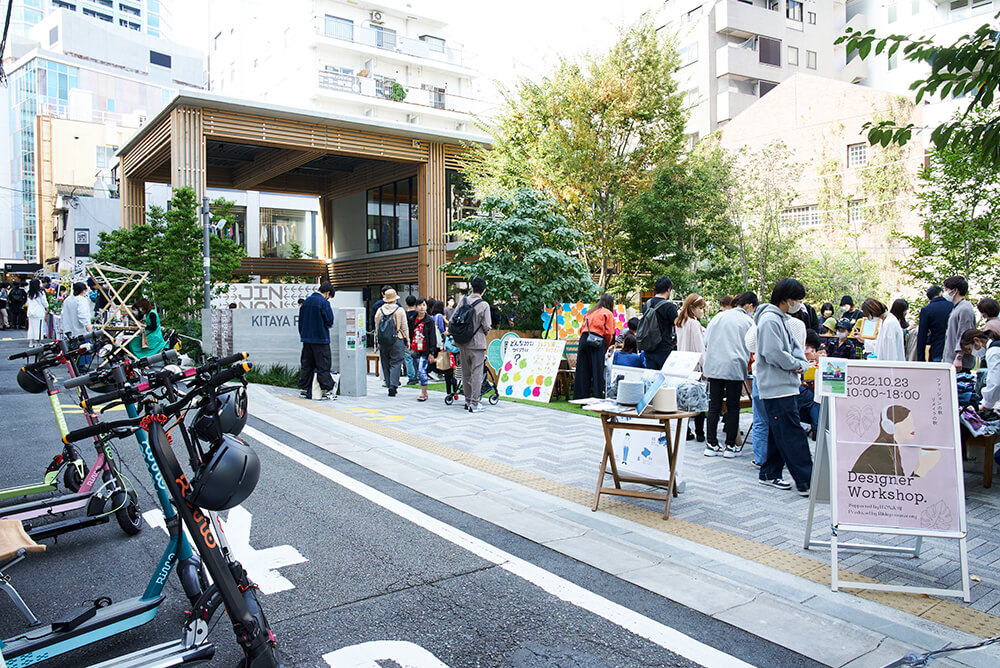 北谷公園を、より多くの人の願いを叶える公園にしていく企画として、日建設計が企画開発した可変型木質ユニット「つな木」でできたゲートを特設。イラストレーターにあなたの想いを伝えると、それがイラストになってゲートが彩られていきます。